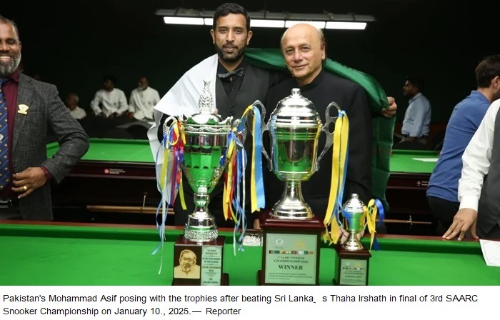 Pakistan's renowned cueist, Mohammad Asif, triumphed at the 3rd SAARC Snooker Championship held in Colombo on January 10, 2025, defeating Sri Lanka’s Thaha Irshath in a dominant 5-0 victory. Asif, the world amateur snooker champion, displayed impeccable skill throughout the final, claiming the title without dropping a single frame.