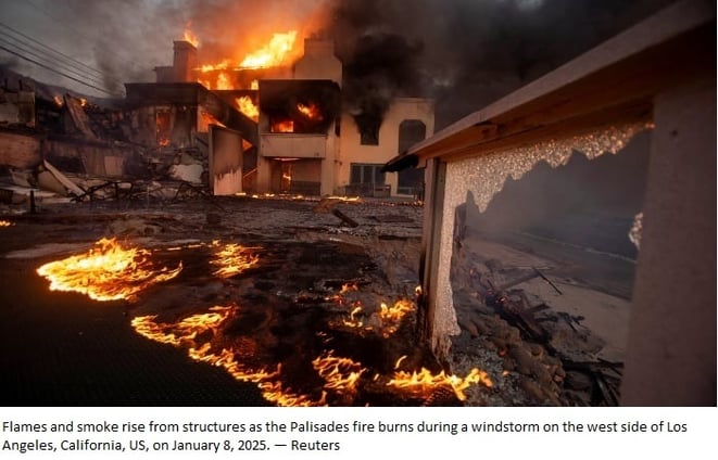Hurricane-force winds have fueled firestorms in the Pacific Palisades, a wealthy area favored by Hollywood celebrities, consuming 16,000 acres (6,500 hectares) and approximately 1,000 homes and businesses. Another blaze in Altadena, covering 10,600 acres (4,300 hectares), has torn through suburban neighborhoods.