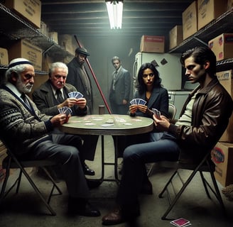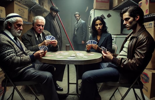 Uncle Abe: “Pass.” Dad: “Pass.” Uncle Will: “Pick it up.” Spades are trump. Another round, another silence. Uncle Abe shoots a look toward Uncle Will before leading with a high red Ace. His whole hand is red, useless against spades, but Uncle Will has enough black to carry them through. The usual banter is absent, and the silence fills the store.
