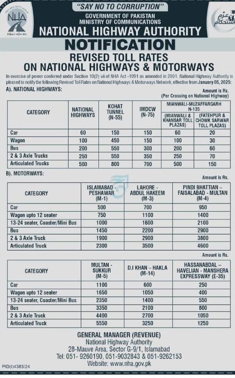 بڑی گاڑیوں کے لیے ایم 1، ایم 3، ایم 4، ایم 5، ایم 14 اور ای 35 پر ٹول ٹیکس 750 روپے سے بڑھا کر 5550 روپے کر دیا گیا ہے۔